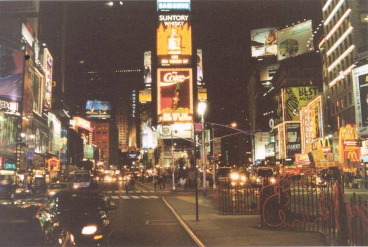 Times Square by night. Apparently the owners of the buildings are required to carry the advertisements, and that's how they make their money. The tenants pay no rent. |